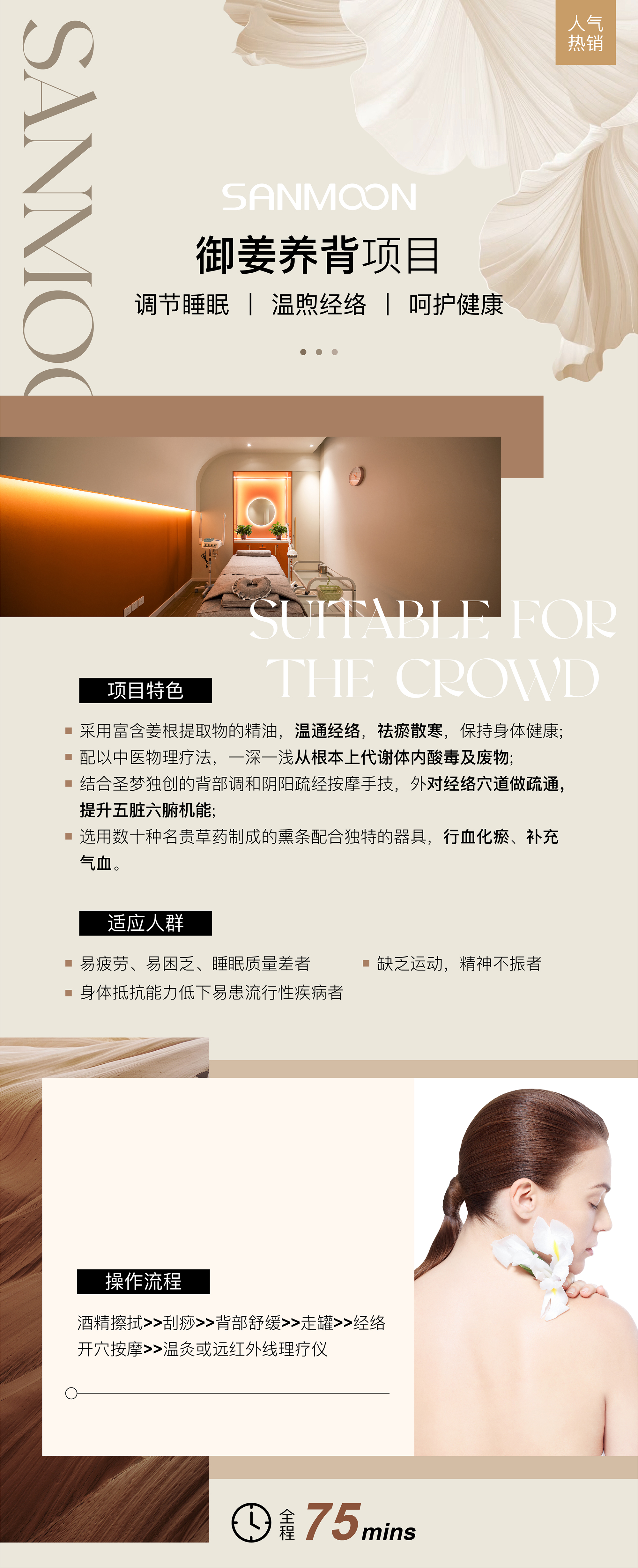 身体护理圣梦王牌暖姜护理,融合姜汁精油与古法理疗手法,辅以温负器具,舒缓放松、驱寒排毒、帮助身体循环,体验身心舒适。